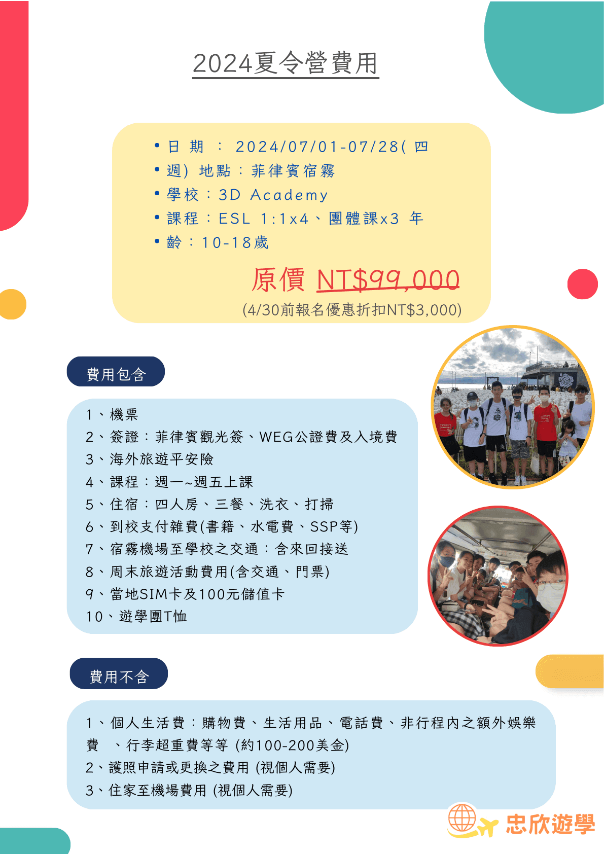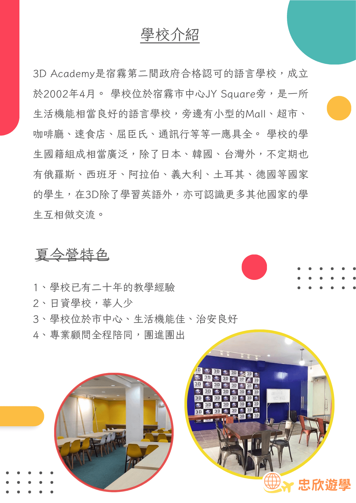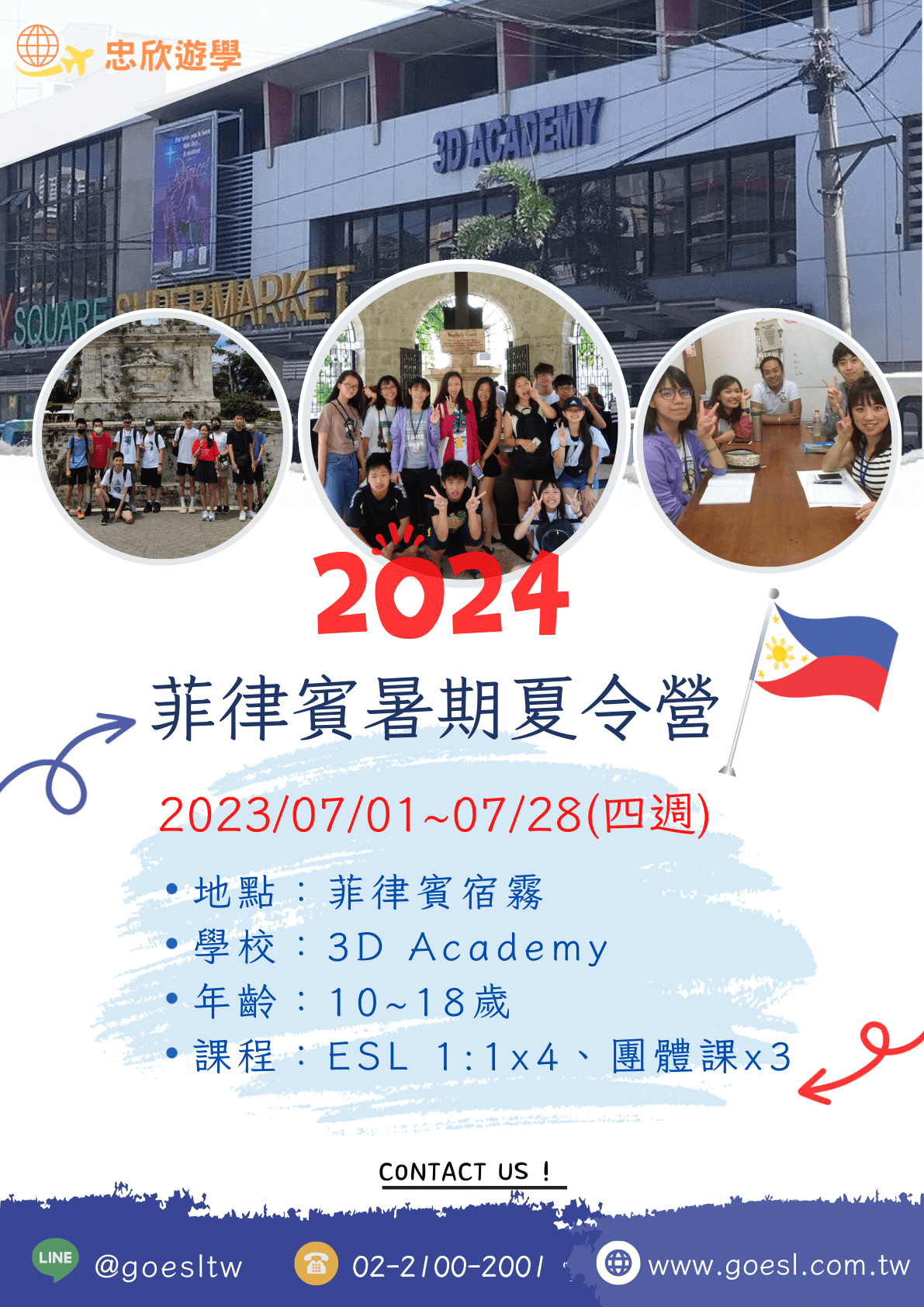 在宿霧歷史悠久的3D語言學校,承辦多國(日本、俄羅斯、台灣)英語夏令營多年,今(2024)年開放名額不多,歡迎聯絡我們了解更多細節。※名額有限,報名從速