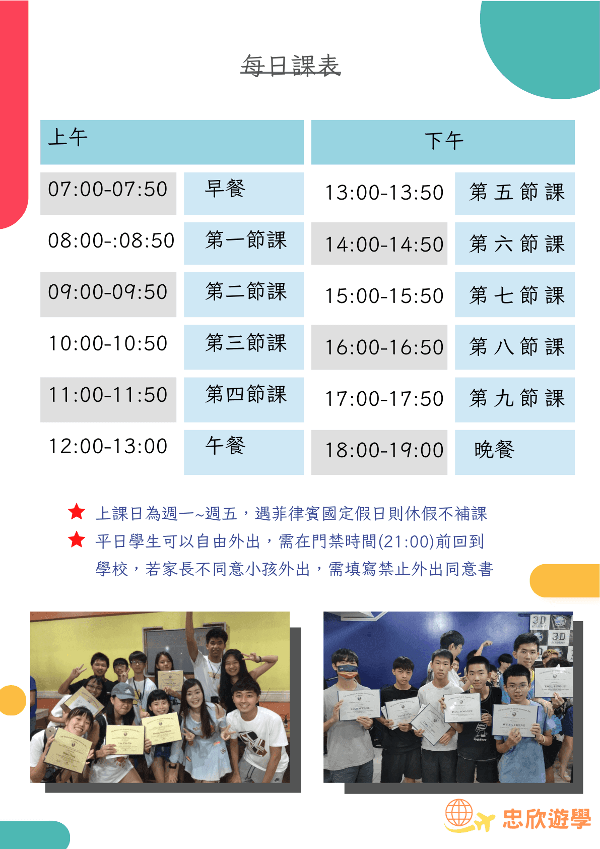 宿霧3D英語夏令營深受許多家長愛戴,除了課程內容密集活潑,活動安排也能讓學生充份體驗不一樣的風俗民情,拓展其國際視野和素養,尤其規律的營隊作息,讓學生增強自我管理能力、獨立生活更有自信。