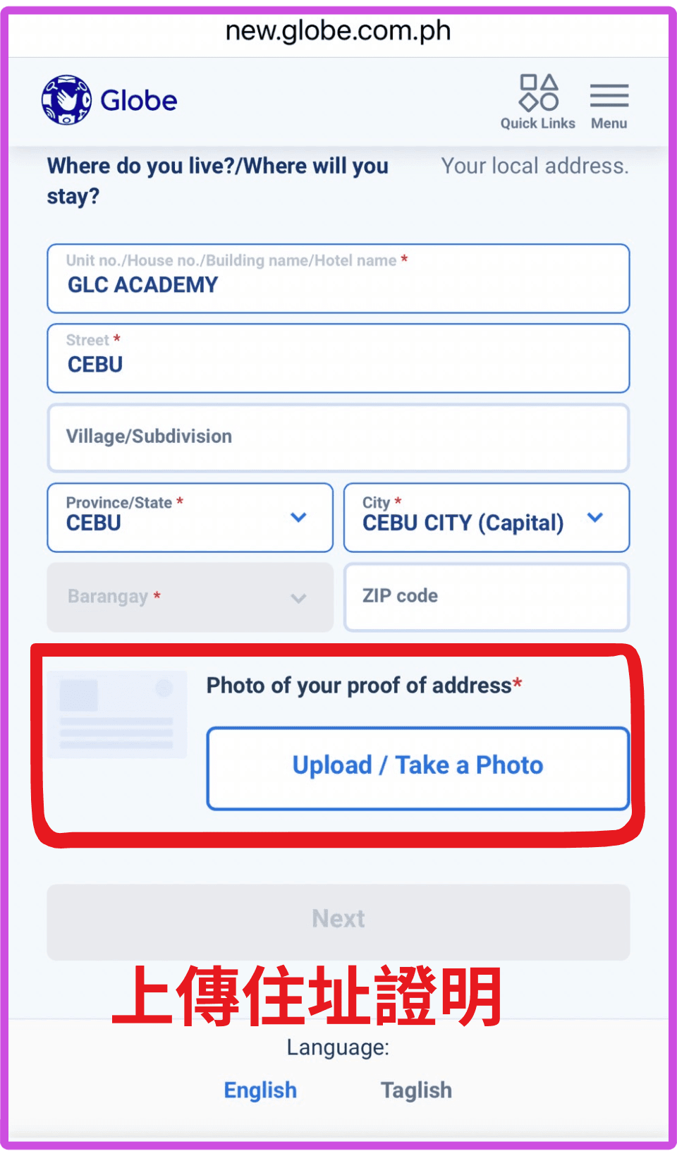 步驟三:上傳在菲居住地