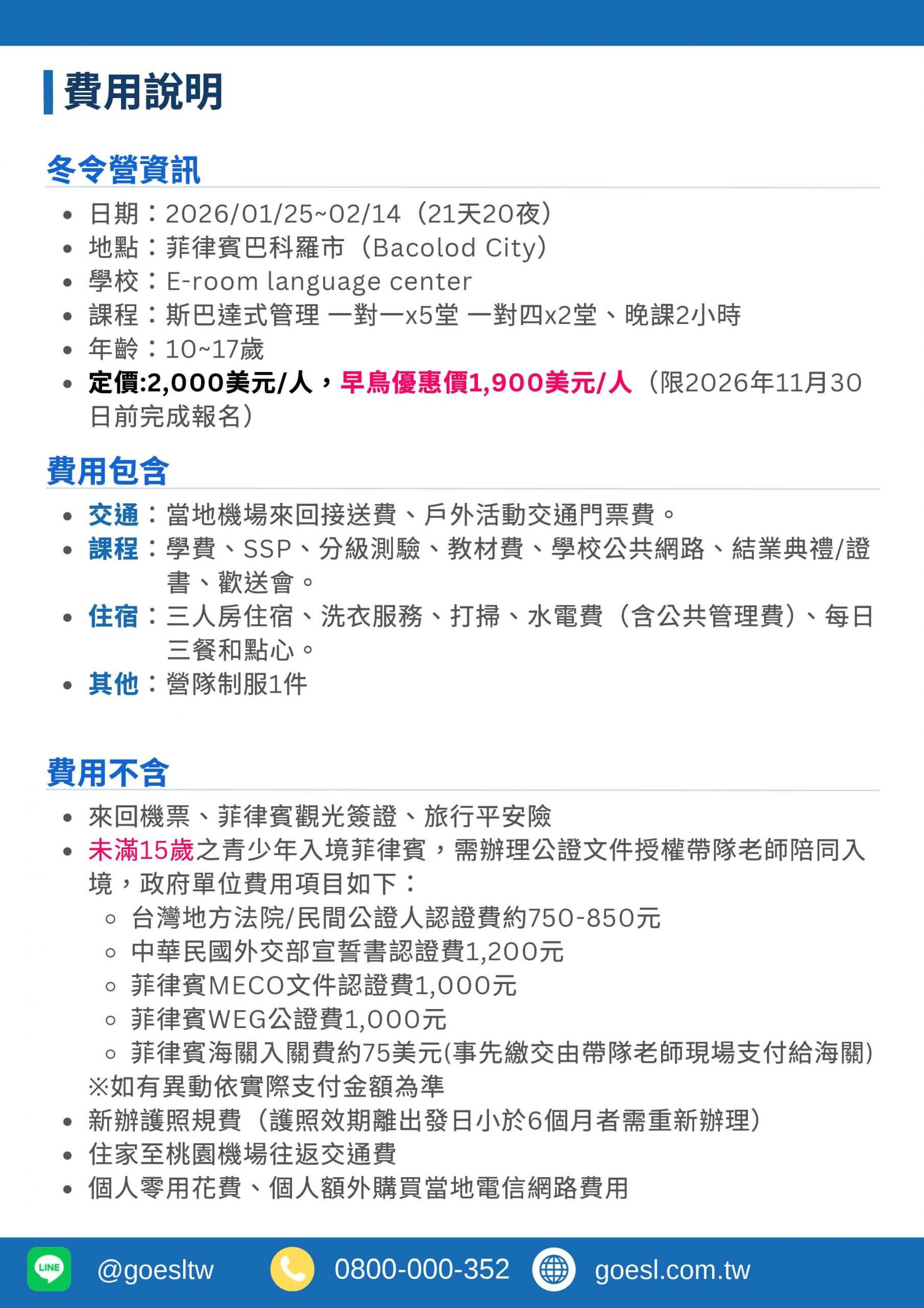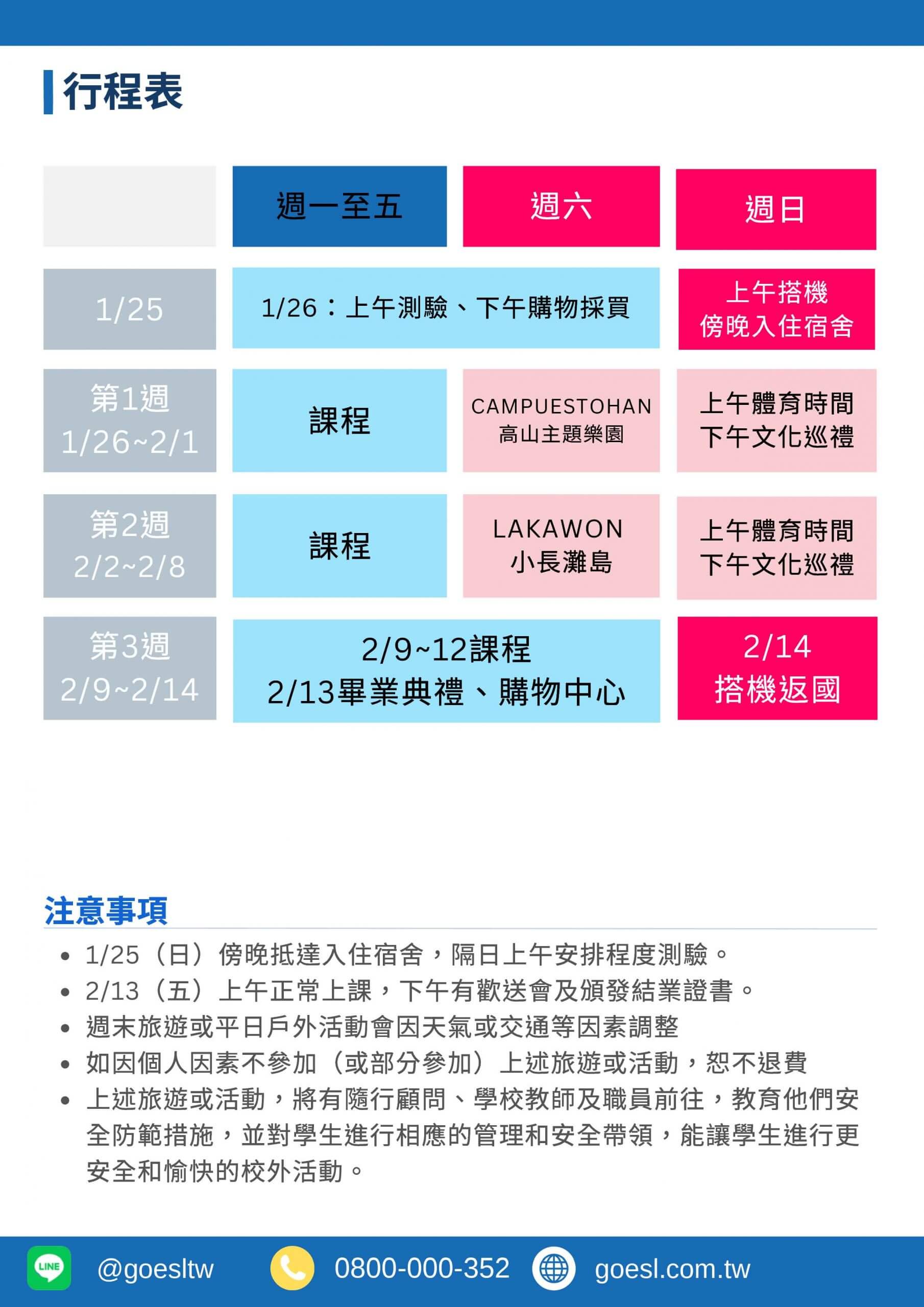 課程:學費、SSP、分級測驗、教材費、學校公共網路、結業典禮/證書、歡送會。