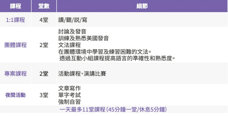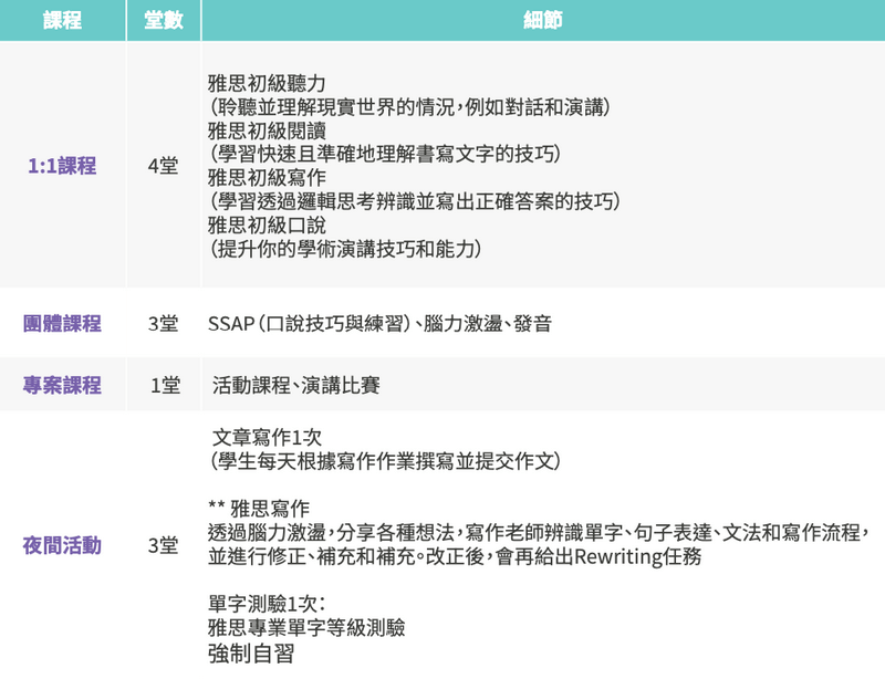 「高密度課程+團隊管理+週末活動」,課程內容分成 ESL和IELTS,高強度學習、作息按表操課!強度夠、生活規律,一次夏令營到手英文技能!