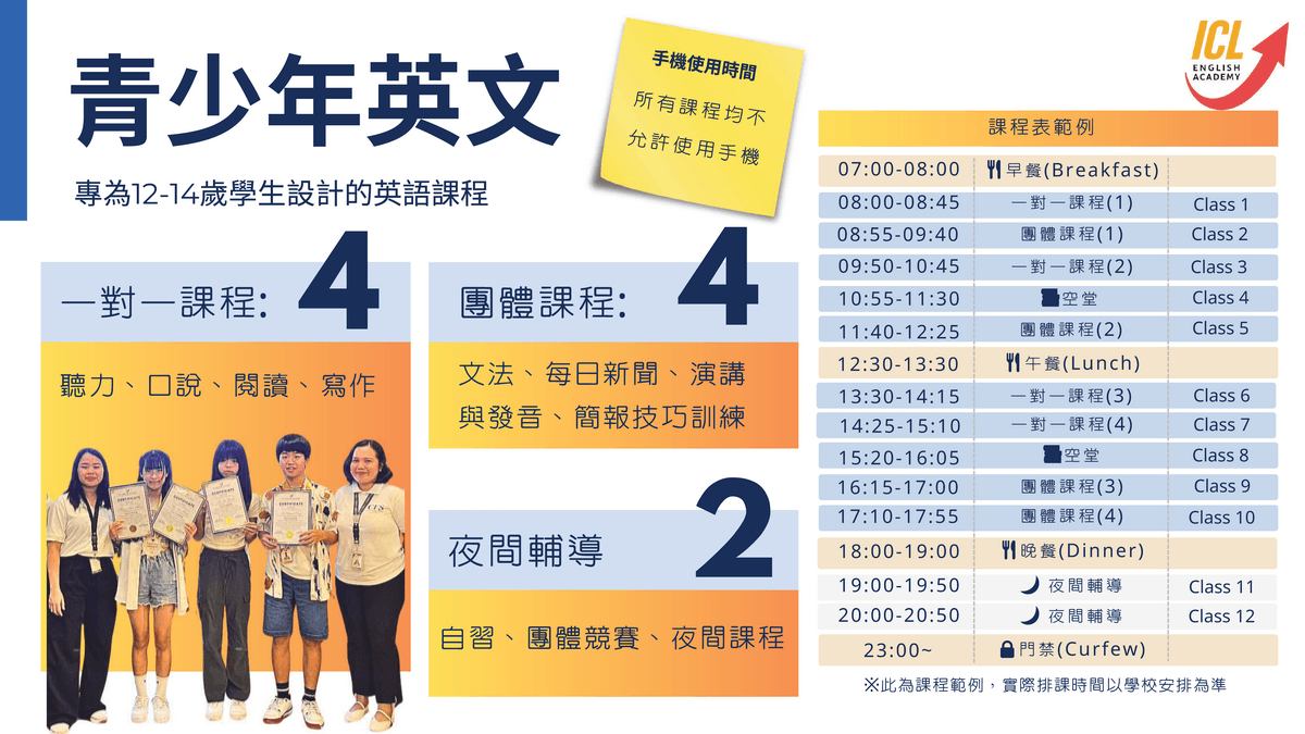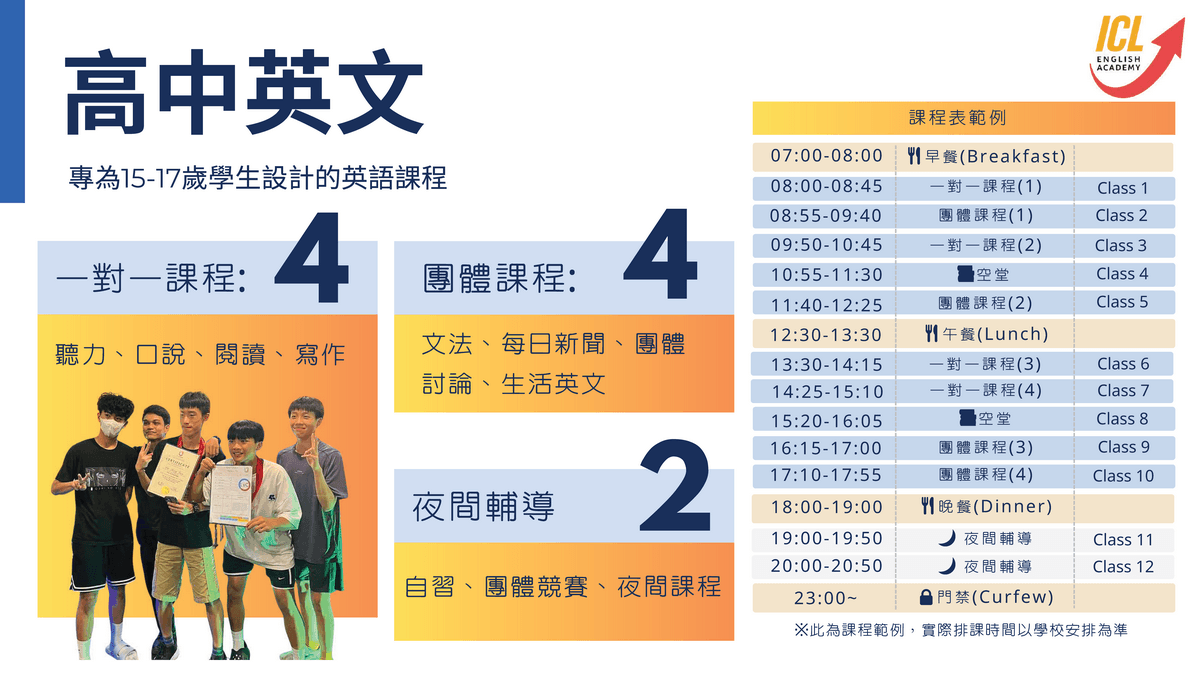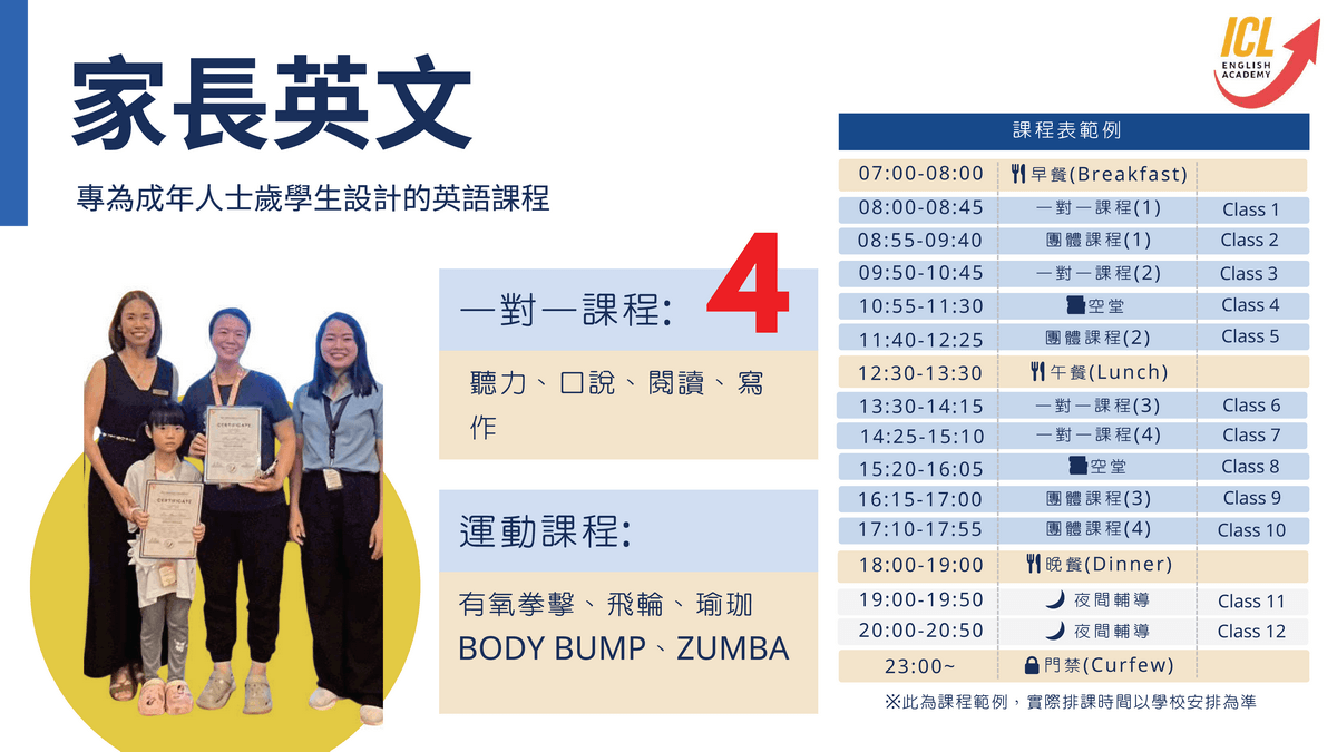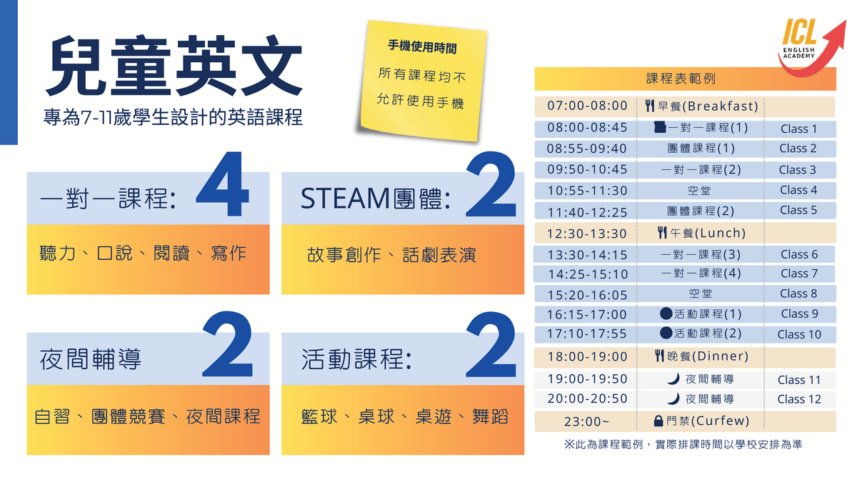 ✨ ICL分齡式英語課程、創意活動與完整校園生活,讓孩子自然開口說英文;住宿、用餐、上課一次到位,家長帶孩子出國安心又省心。