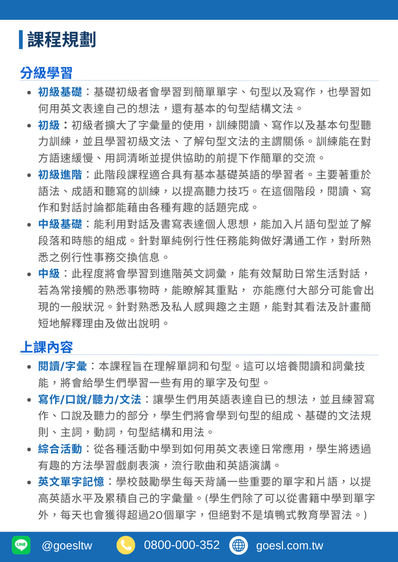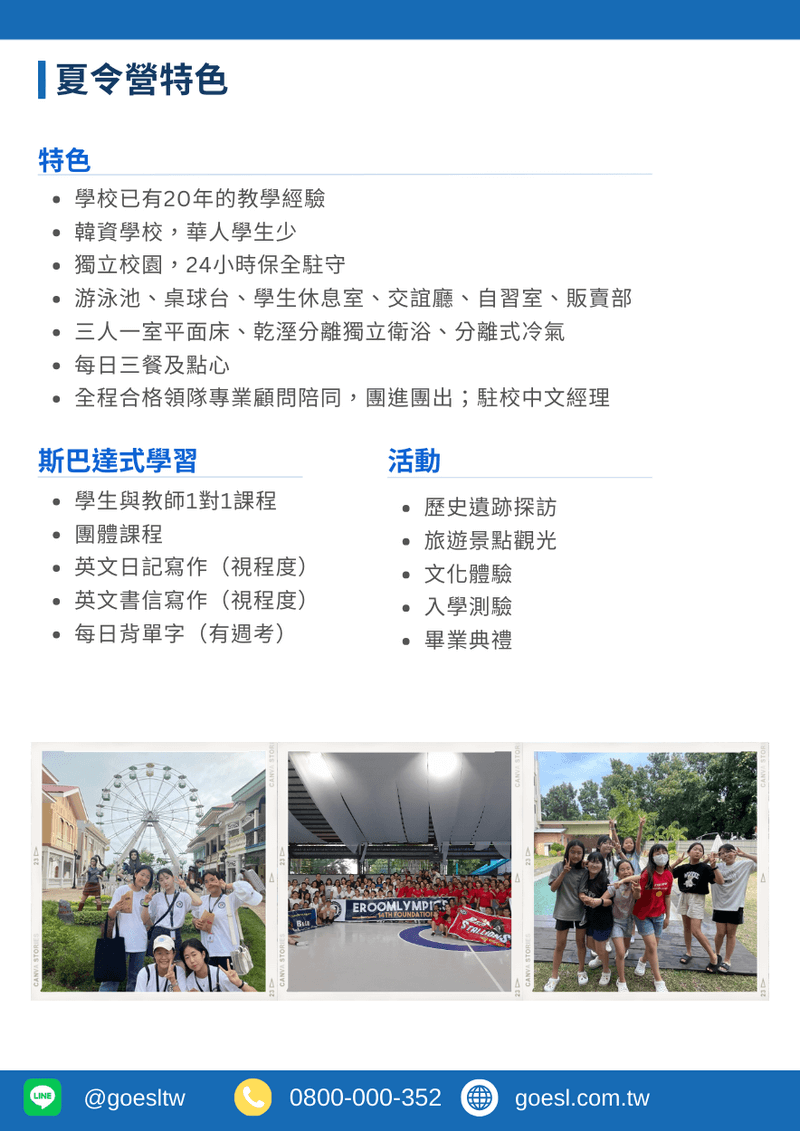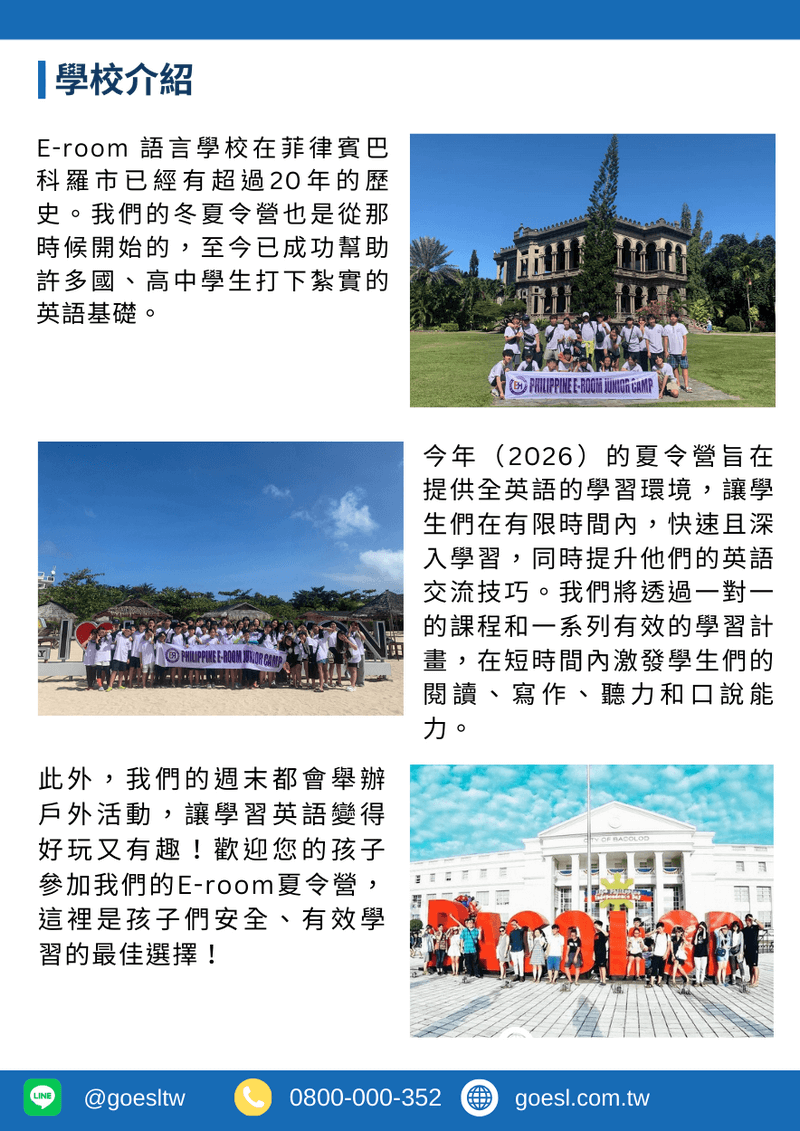 20年教學經驗,至今已成功幫助許多國、高中學生打下紮實的英語基礎。今年(2026)夏令營旨在提供全英語的學習環境,讓學生們更深入地學習,同時提升他們的英語交流技巧,透過一對一的課程和一系列有效的學習計畫,在短時間內激發學生們的閱讀、寫作、聽力和口說能力。此外,我們每週末都會舉辦活動或特別課程,讓學習英語變得好玩又有趣!歡迎您的孩子參加我們的夏令營,這裡是孩子們安全、有效學習的最佳選擇!