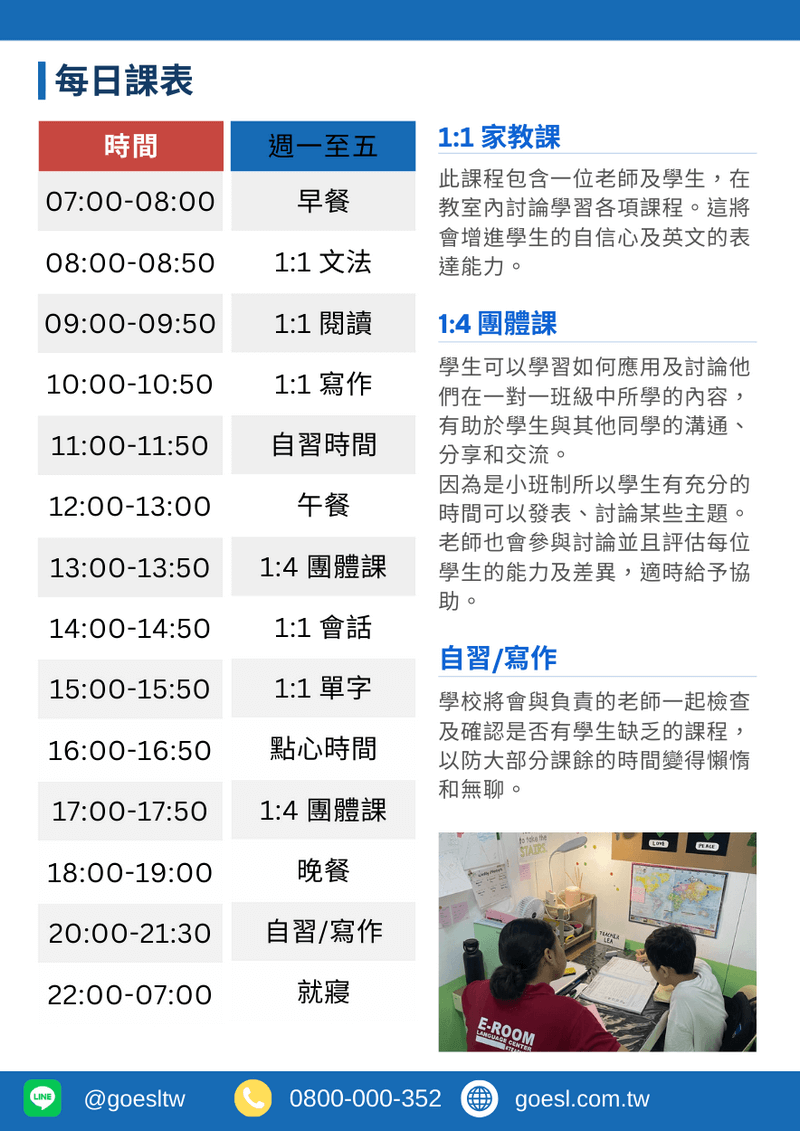 每日:5堂一對一 + 2堂團體課 + 2堂夜間課程