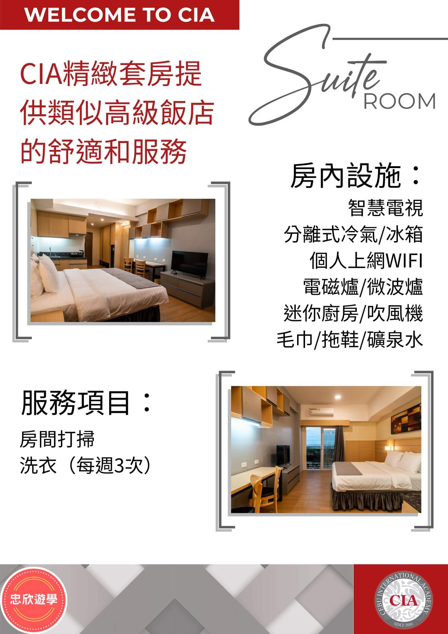 | 專人服務 | 每日三餐、定期洗衣服務及房間打掃 |